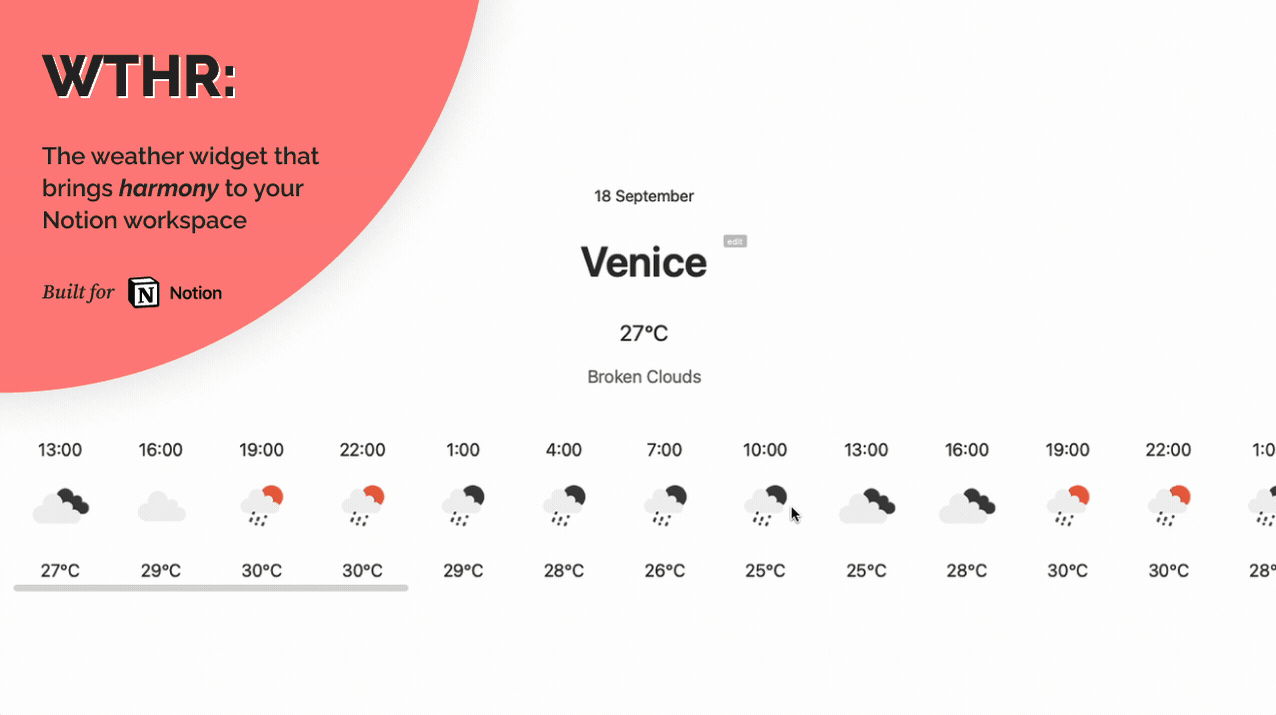 Add the WTHR widget to as many Notion pages as you need. Each embed will retain the customisations you made without affecting other pages.