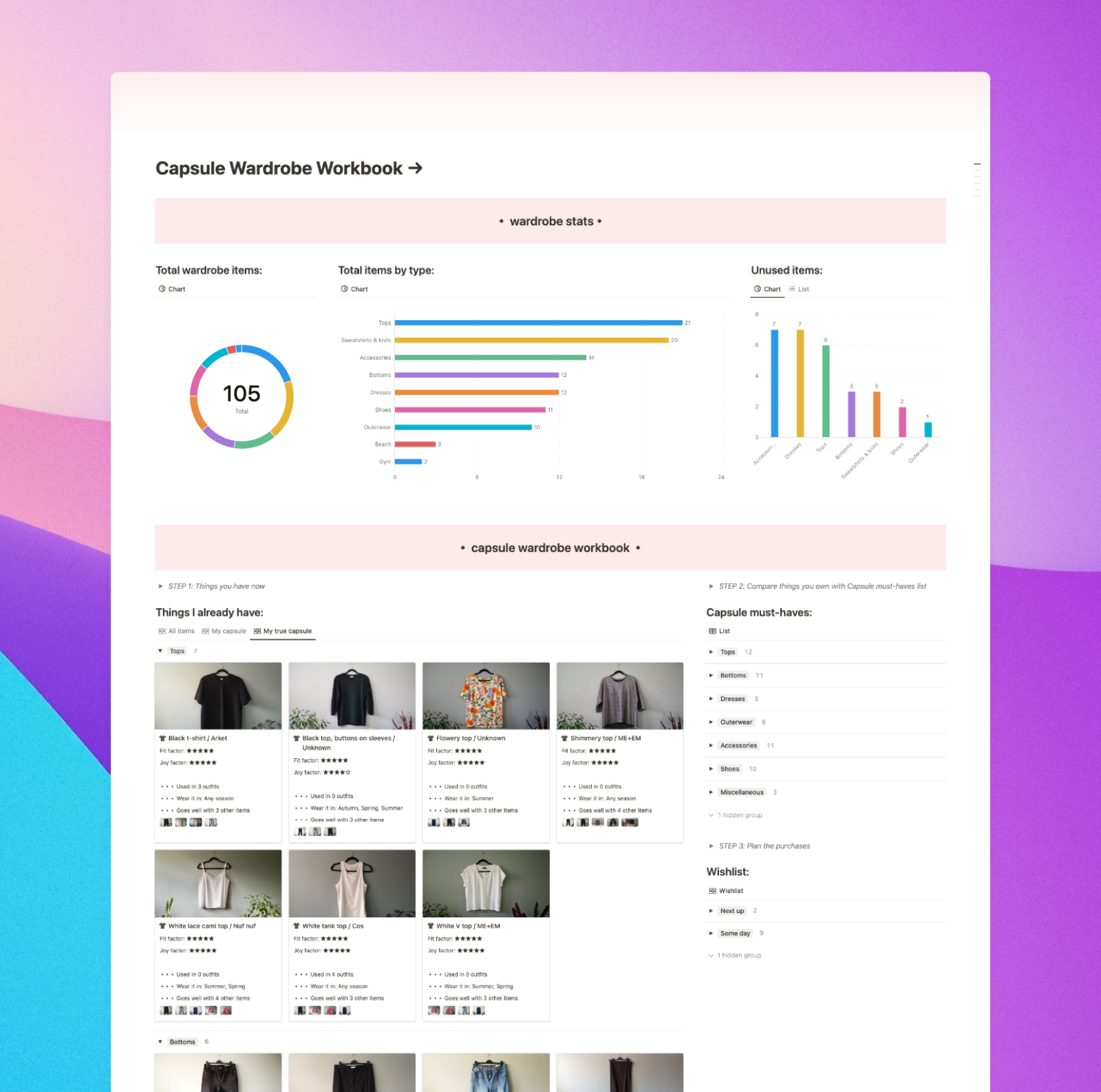 Beautiful notion charts visually represent all your wardrobe items, changing as you work through your wardrobe.
