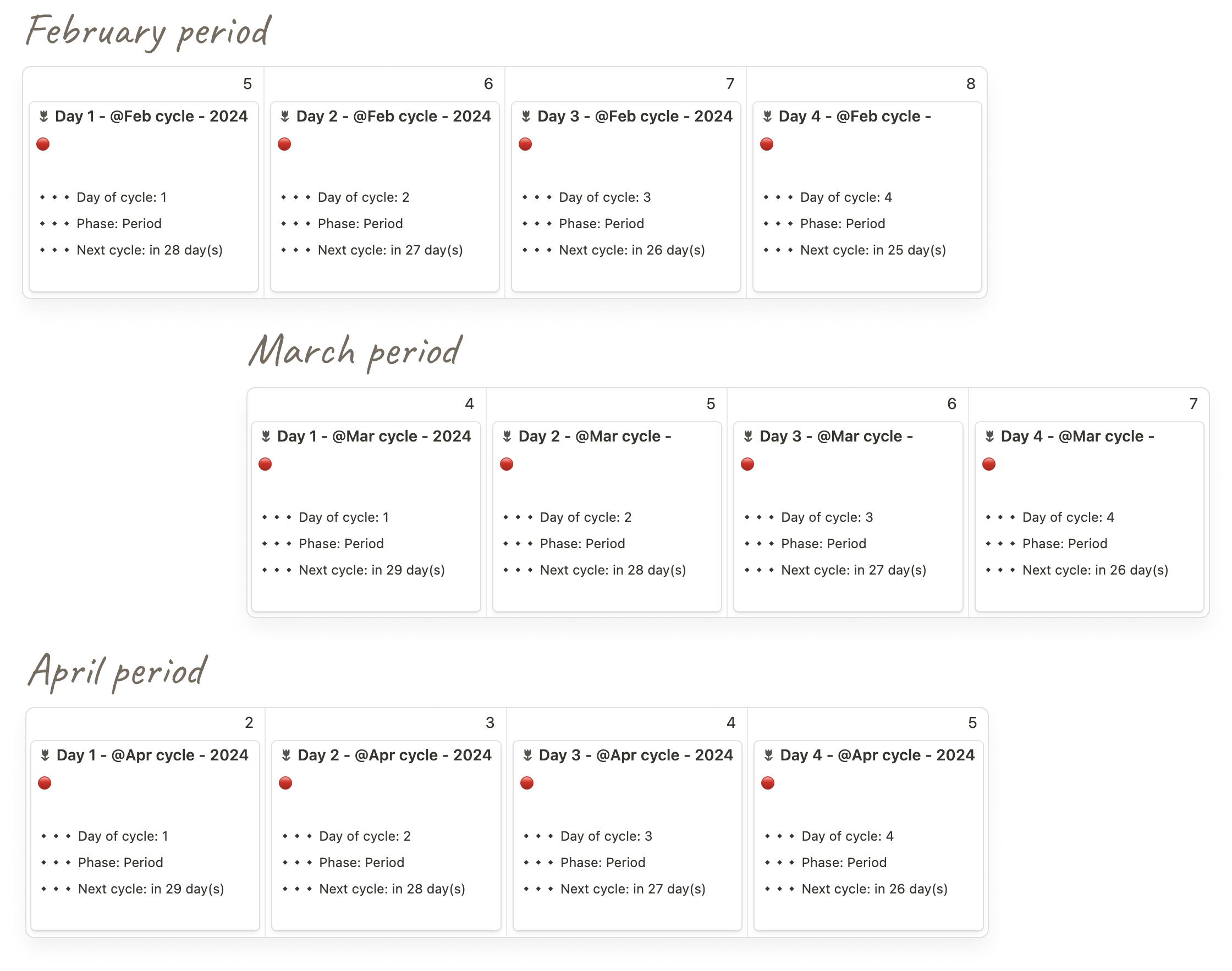 All your periods in a powerful calendar view. Add any data that matters to you, and connect to any other database. Notion calendar ready.