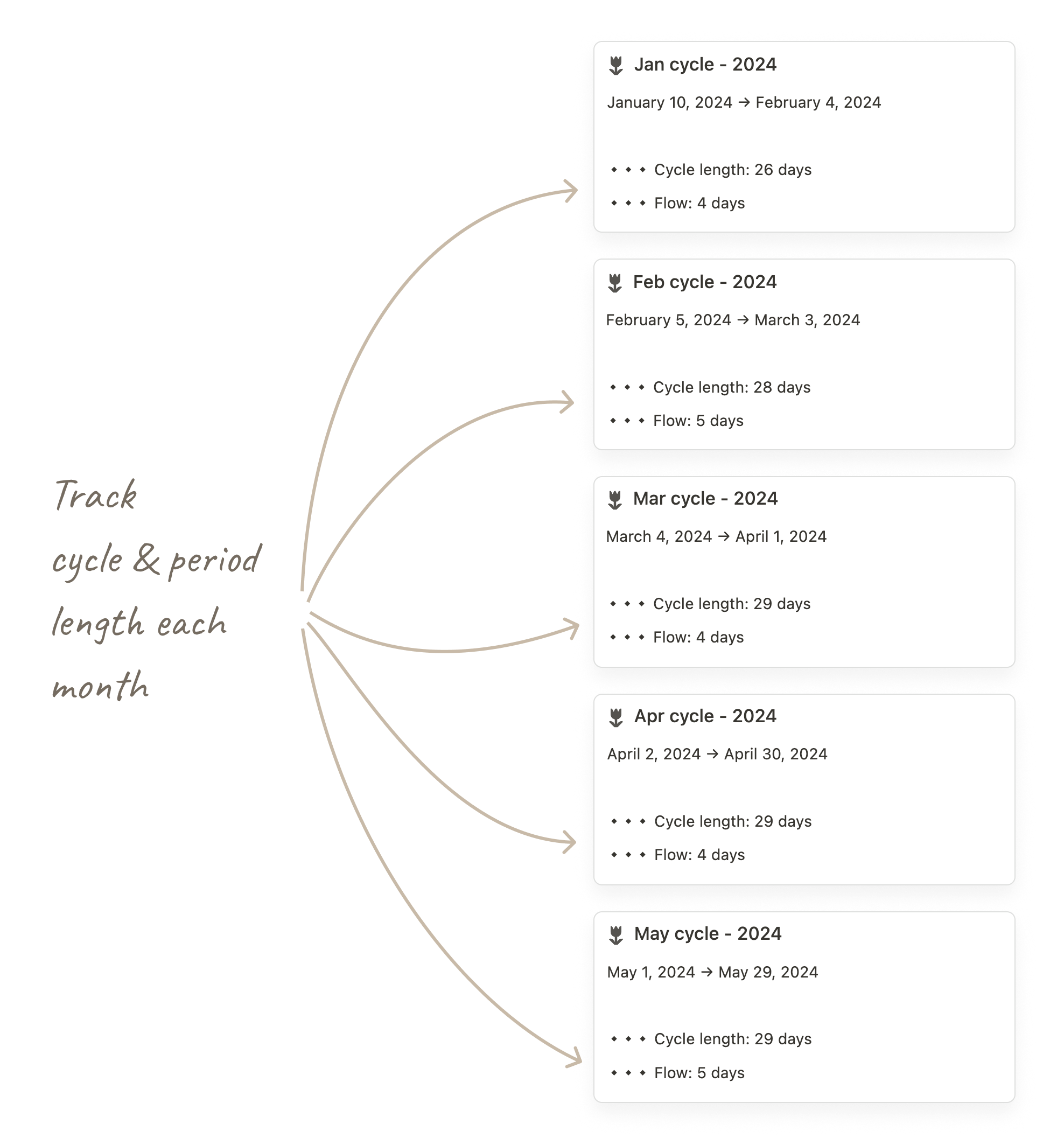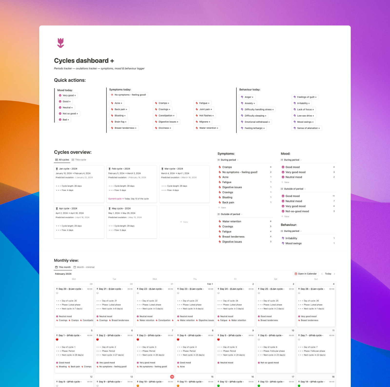 That's where the Cycles Dashboard + Notion period tracker comes in. It helps you to keep tabs on the rhythm and patterns of your cycle, and to catch any potential issues early on.