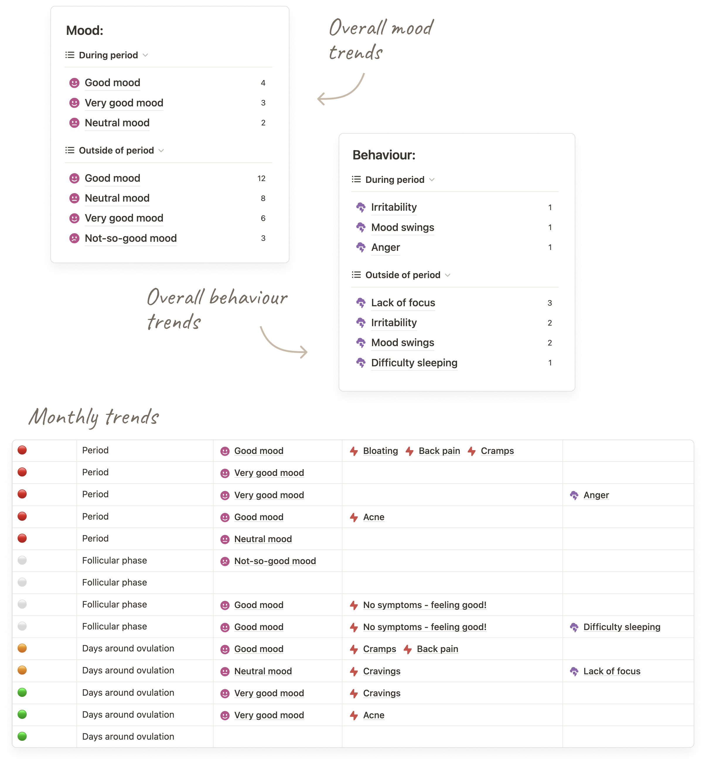But guess what? Cycles Dashboard + Notion period tracker has your back. It lets you track everything from mood swings to cramps, so you can really understand what's going on with your body. By spotting patterns and triggers, you can develop personalized strategies to tackle PMS head-on, giving you better control over your menstrual health.